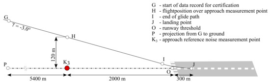 The noise during approach is evaluated at another measurement point during noise certification, which is shown in Figure 2, together with the specified approach path. The approach flightpath must be recorded from point G, which is 7400 m in front of the runway landing threshold. The projection of this point on the ground is called point P. This approach reference noise measurement point (K) is located 2000 m in front of the runway landing threshold (Point O) in the extended runway centerline. Taking into account the prescribed glide path of 3, the aircraft flies over the measurement point at an altitude of 120 m (Point H), where the aircraft is in a stabilized state and the engine is not idling, as is the case in other phases of the approach. It should be noted that an altitude deviation of 20%, i.e., ±24 m, is allowed at Point H. The glide path ends at point I and the touchdown takes place at point J, about 300 m behind point O.