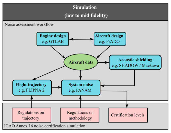Based on existing DLR software tools, and considering the ICAO regulations, a dedicated and fully automated simulation process has been assembled to realize a simulated noise certification [8,9]. The new and fully automated simulation process predicts certification levels within the conceptual aircraft design. The ICAO regulations can be assessed based on the available data within the simulation process. The underlying process of assessing the certification is complex and consists of (1) a detailed simulation of the flight path under the given constraints, (2) calculation of the sound emission based on the operating conditions and configurational parameters prevailing in proximity to the certification measurement points, and (3) the modeling of the sound propagation and ground attenuation effects. With this new simulation process, noise certification levels can now be predicted for both existing and novel aircraft concepts. The resulting cumulative noise levels can be directly processed as an optional design objective within the conceptual aircraft design. Different sensitivities of flightpath or design parameters on the certification noise can be investigated simulateously for the first time in one overall simulation process. Predictions for existing vehicles can be compared to published and available data in order to verify the simulation results. It should be noted that the presented activities at DLR do not aim to create a virtual replacement of the actual certification process. The goal of the presented activities is to provide reliable estimates of certification levels to enable a direct comparison of different technologies and designs. Furthermore, comparison to other simulation activities based on certification noise levels is enabled, e.g., research activities at NASA [4,5,6,7]. Furthermore, the certification assessment does enable quick comparative studies within the conceptual aircraft design, where significant variations in aircraft design, engine design, selected technology modifications, and flight performance are still realizable, and hence open up a huge solution space.