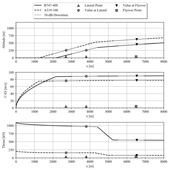 Altitude, thrust and calibrated airspeed profiles over the flightpath used to calculate certification levels are shown in Figure 4 for both aircraft. The authors highlight that there is no available information on official noise certification trajectories. Therefore, the trajectories shown and studied here are the result of an optimization to reduce EPNL at the individual measurement points, taking the certification regulations into account. As can be seen, the trajectories of the two aircraft studied differ greatly due to their significant differences in flight performance.
