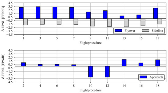 To further investigate the significant influence of the flight path on the certification levels, certification levels are predicted based on available flight data for an A319-100 aircraft [31]. The available approach-and-departure flight data from this measurement campaign at the Baltic Airport near Parchim (Germany) are used to calculate the respective certification levels. The available measured noise levels for A-weighted SPL were studied in great detail and show good agreement to the predictions; see Reference [1]. It should be noted that no EPNL measurements are available from this campaign. Due to the underlying motivation behind this flight campaign, no departure flight procedure fully complies with the allowable operating conditions according to the ICAO regulations [3]. The flight altitude above the approach measurement point is too high for approach paths 10 and 12 in Figure 5. This has to be kept in mind when comparing these predictions to the published certification levels. The other approach paths are certification-compliant and show very good agreement with the measured EASA levels. The minor differences between the procedures are due to the slightly different thrust settings and flight altitudes. When comparing with the simulated flight trajectories, it is noticeable that the approach speeds from the FDR data are lower, which lead to lower certification levels. This may indicate that the accuracy of the characteristic speeds in the preliminary design is limited. However, this comparison gives a good indication of the sensitivity of the flight procedures at the certification points, and also can confirm tendencies and trends. As shown in Figure 5, it can be demonstrated that all flight procedures result in higher noise levels at flyover measurement points in comparison with the noise levels published by EASA. Overestimation rates from 0.5 to 3 EPNdB are documented for the flyover situation. Obviously, the differences between the actual flight tracks of the certification and the simulated flights have a great impact. An underestimation of from 1.5 to 2.2 EPNdB at the sideline certification points is observed where the underestimated levels are also experienced when working with the simulated flight procedures. Comparing level differences between the individual flights confirms the expected trends and the applicability of simulation results for a comparative assessment, i.e., see Reference [32].