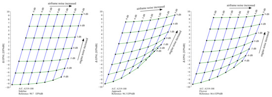 First, it can be shown that the noise sources of the engine dominate the immission at all three measurement points considered. For conventional tube-and-wing aircraft with turbofan engines, as considered here, airframe noise contribution is also insignificant at the approach certification noise measurement point. During its final approach, the flight segment increased-engine thrust settings are required to compensate the drag of deployed high-lift elements and landing gear while maintaining a prescribed flight velocity. Consequently, the engine noise clearly and constantly dominates the airframe noise contribution at the approach measurement point. Engine noise would have to be reduced drastically in order to see any impact of the airframe noise sources on the approach certification noise level, e.g., Figure 6. Consequently, for an efficient reduction in certification levels, noise abatement measures at the engine should be considered first; a quiet airframe would only after a drastic engine noise reduction. For the B747-400, the results are qualitatively very similar, but are not shown here for the sake of clarity. However, it is obvious that the influence of airframe noise on EPNL increases from sideline to flyover and from flyover to approach. This is due to the respective thrust setting, since this decreases in the aforementioned order. While the airframe has almost no influence on the sideline for all the considered modifications, there are changes in the certification level for flyover when the engine noise is significantly reduced. For the approach, this effect is even more pronounced, and smaller changes are also seen if the engine noise sources remain unchanged.