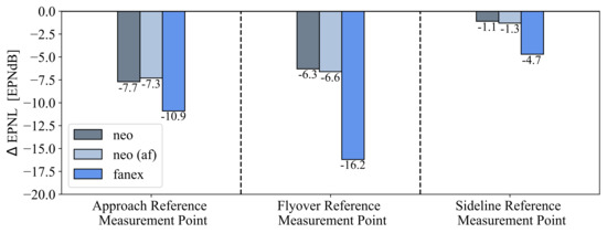 The noise certification simulation results are shown in Figure 7 for the three configurations neo, neo (af) and fanex relative to the reference aircraft zero. The corresponding lateral measurement position is adapted accordingly for each configuration. The distances from the lateral measurement point (highest EPNL along the takeoff flight path) to the break release point differ between the four configurations. For zero (2600 m) and neo or neo (af) (2500 m), there are only minor differences. For fanex, the lateral measurement position is significantly closer to the break release point (2000 m) as the forward-directed engine noise is shielded by the fuselage and wings. Reductions in certification levels are observed at all three measurement points, with neo and neo (af) showing very similar results. Small deviations may result from different characteristic airspeeds and slightly different aircraft masses. It can be demonstrated that the use of a low-noise airframe in the context of noise certification has only a small advantage. For neo and neo (af), the 10 dB-downtimes are similar to those of the reference aircraft. Due to the fan’s tonal contribution, the reference engine has an additional tonal penalty at the sideline measurement point, which does not occur with the GTF engine. This leads to a reduction in the PNLTM.