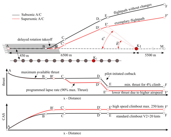 Recently, noise certification rules for future supersonic aircraft have been presented by the Federal Aviation Agency (FAA) and the Department of Transportation (DOT) [35] as a consequence of recent industry activities, e.g., product announcements of supersonic business jet developers such as Boom and Aerion. Again, specific limits for the operation are defined and the EPNL is assessed at the three measurement points. The proposed regulations solely focus on the take-off situation and can be directly implemented into the existing simulation framework to enable a virtual certification process, i.e., under the assumption of constant approach definitions for subsonic and supersonic vehicles. Due to the high thrust requirements for supersonic cruise flight, these SST vehicles use engines with a high specific thrust, tailored to cruise conditions. This results in large excess thrust levels during takeoff, i.e., high jet exit velocities and jet noise generation, as demonstrated by various researchers, e.g., References [36,37]. As a consequence, it can be expected that the direct application of current regulations for subsonic aircraft to supersonic vehicles would result in significantly increased take-off noise levels compared to subsonic transport vehicles, particularly at the lateral measurement point. Therefore, new take-off regulations for supersonic aircraft were proposed by the FAA in order to specifically enable further reductions in take-off thrust settings in proximity to the measurement points and allow for different flight velocities according to the specific SST aerodynamics, e.g., as discussed in Reference [36]. The overall goal of the modifications is to achieve noise certification levels for supersonic aircraft that remain below the published noise limits, applicable to subsonic aircraft of a certain noise category. The discussed rule change regarding take-off, and its influence on certification flight altitude, total thrust and airspeed, are depicted in Figure 9. At the top of this figure, the altitude profiles are shown, commparing subsonic and supersonic aircraft. The first proposed modification focuses on the take-off speed regulations, which are defined relative to the aircraft-specific safe takeoff speed V2. The default speed range is removed, and only the default maximum airspeed of 250 kts is maintained for the SST, to enable a high-speed climb, which can be associated with reduced ground noise impact along the take-off trajectory. According to Reference [36], the higher airspeed reduces the required engine thrust, so that, for the flyover measurement point, the lower thrust should lead to a reduced certification level. This is achieved by a delayed rotation takeoff, i.e., longer acceleration segment on the ground, which can also be seen in the calibrated airspeed profile at the bottom of the figure (from Point A to Point F’). This should enable higher lift-to-drag ratios, and thus optimize flight performance. Furthermore, an additional thrust reduction of up to 10% before the typical pilot-initiated cutback is being considered, which is not allowed for subsonic aircraft. This modified procedure is called Programmed Lapse Rate (PLR), and was developed in the 1990s [38,39] and applied to SST aircraft by NASA [36,40]. This thrust reduction takes place after the obstacle height is reached, and can be seen in the thrust profile in the middle of the figure, between Point C and D’.