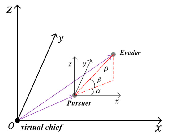 where the subscripts of and stand for Pursuer and Evader, respectively, is the orbital rate of the virtual chief and is the control acceleration, which is loaded on the participants along the three axes of LVLH frame.