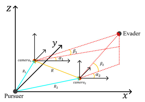 where the subscripts 1 and 2 are the label of sensors, and stand for the relative position from the Evader to the cameras, respectively, and the vector represents the baseline between two cameras, which is supposed to be known and can be calculated from the locations of the cameras.