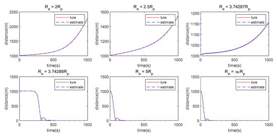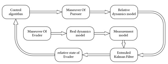 Obtaining the optimal control law of the Pursuer requires acknowledging the relative state vector of the Evader with respect to the Pursuer, as Equation (46) shows. When treating the Evader’s maneuver as colored noise, it is impossible to obtain accurate relative state vector from the relative dynamic model, and the state of the Evader needs to be extracted from the observation information. Thus, an extended Kalman filter is used to obtain the estimated value of the relative state .