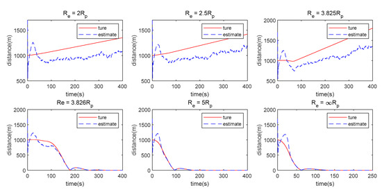 is the boundary beyond which the Pursuer can approach the Evader when the LOS range measurement is used. Figure 8 shows the case where , and the Evader takes different maneuvering weight matrices , respectively.