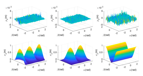 When angle and distance measurements are used for observation, the equivalent position measurement can be obtained through numerical calculation. The mean value and standard deviation of the measurement error are shown in Figure 6. Figure 6 also shows the Pursuer’s measurement precision for a 1 km range using the accuracy from Table 3. The equivalent position measurement error is 1.2 m (maximum).