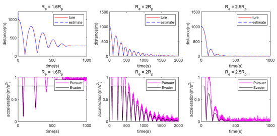 First, the optimal control law obtained by the Evader using complete information is analyzed, where the Pursuer’s maneuvering weight matrix is , and the Evader’s maneuvering weight matrices are respectively to verify the effectiveness of the algorithm with different forms of maneuverability of the Evader, shown in Figure 5.