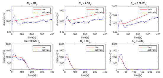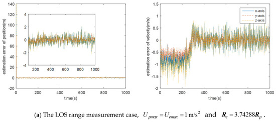 Equation (14) is a non-homogeneous linear equation if the maneuver of Pursuer is non-zero, where the control vector of Pursuer is non-linear function of state vector . Then, the initial relative state vector can be solved when is known, so the system is observable if the maneuver of the Evader is known. However, the colored noise (the Evader’s maneuver) is unknown, so even if the system is observable, the solution would be polluted, which decreases the accuracy of the solution.