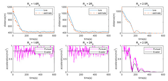 When (the Evader does not maneuver), as the observability analysis indicated, the Pursuer can approach the Evader. However, when the Pursuer is sufficiently close to the Evader, the Pursuer’s maneuver is not obvious, which leads to non-observability of the system, so the Pursuer moves away from the Evader, as shown in Figure 5.