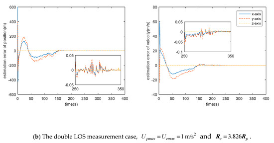 - There is still some position/displacement/distance estimation error, although observability is improved by adding the distance measurement or when the double LOS sensor measurement is used, as shown in Figure 11. Thus, the Pursuer cannot catch the Evader when in the LOS range measurement case, or in the double LOS measurement case. The critical value of with which the Pursuer can catch the Evader will be smaller if .