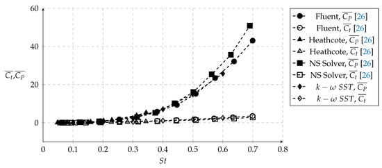 The graphs of Figure 3 and Figure 4 reveal that the mean propulsive coefficients and propulsive efficiency obtained with the SST turbulence model follow published data over a wide range of Strouhal numbers. Small discrepancies arise from the use of the turbulence model, which slightly underestimates and overestimates at lower and higher Strouhal numbers, respectively.