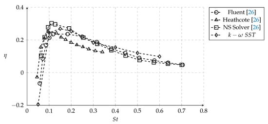 The validation of the numerical methodology was achieved by comparing the results obtained with those published by Heathcote et al. [], NS and Fluent simulations for a h of and reduced frequencies in the range to at , presented in []. Figure 3 shows the mean thrust and power coefficients obtained in the present work, using the SST turbulence model. The propulsive efficiency is also compared, shown in Figure 4.