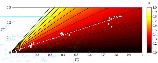 When combining both mean thrust and power coefficients, the propulsive efficiency is obtained, represented in Figure 12 together with the mean thrust coefficient. As expected, due to the non-dependent evolution of with the mean angle-of-attack, the mean thrust coefficient and propulsive efficiency are coupled through a linear relationship which can be expressed as