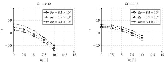 This subsection starts by analyzing the influence of the mean angle-of-attack on the propulsive efficiency of two specific conditions being these, the combination of k and h for the three Reynolds numbers considered in the power and thrust correlations subsection, that maximized the propulsive efficiency with . In Figure 8, the condition with and represents the maximum propulsive efficiency for a Reynolds number of . The same condition was tested for and . At ( and ) propulsive efficiency reaches its maximum at and . Likewise, it is also tested for a Reynolds number of . With this short parametric study, we can observe that increasing the Reynolds number, improves the propulsive efficiency but does not influence the way decreases with the mean angle-of-attack. However, at the highest Strouhal number, propulsive efficiency is much less affected by the increase of .