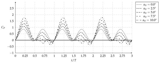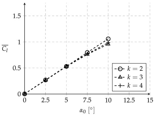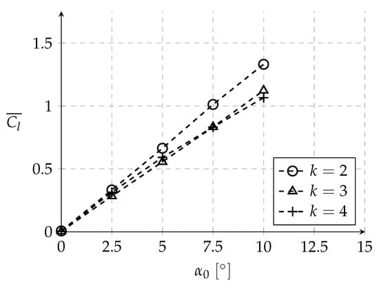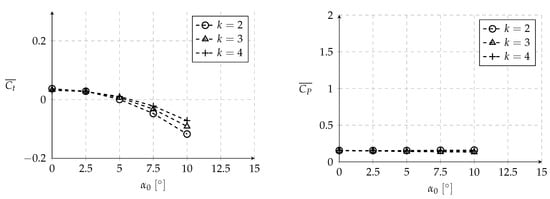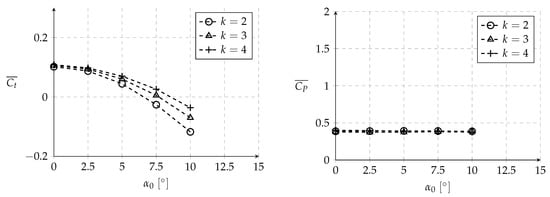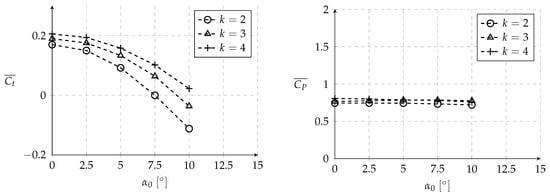The use of symmetrical airfoils has several advantages, such as the high propulsive efficiency they offer []. However, the symmetry of these airfoils causes the average lift force to be zero for a null mean angle-of-attack. Imposing a mean angle-of-attack will inevitably increase lift production and influence the airfoil’s overall performance, discussed in this subsection. The maximum effective angle-of-attack may also be used to analyze this problem since it combines the mean angle-of-attack and the pair, being calculated as