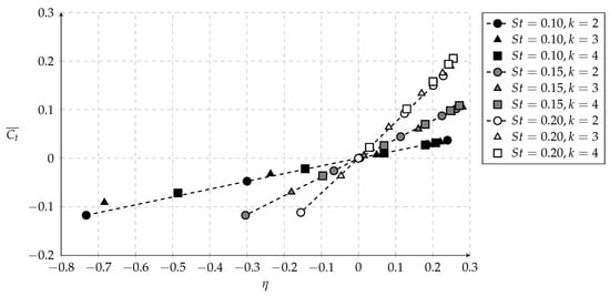 Further investigations conducted by Young and Lai [,] demonstrated the impact that many parameters have in this type of problem. Regarding the Strouhal number, Tuncer et al. [] observed that maximum thrust and optimum efficiency take place at the near dynamic stall boundary. This differs from lower Reynolds numbers, where flow separation is required to guarantee an efficient thrust generation, which makes them conclude that it is more beneficial to operate at a high k and low h than at a low k and high h, as stated in [].