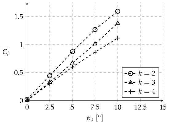 Looking forward to lift production and knowing beforehand that increasing the mean angle-of-attack increases the mean lift coefficient, one could also expect an increase in the power required to maintain the motion, however, such an event is not observed. Such effect raises the question if there is a balancing mechanism between the mean angle-of-attack and the instantaneous lift coefficient when the airfoil’s velocity is kept constant. Before answering that question, in Figure 13, Figure 14 and Figure 15, the mean lift coefficient is plotted against the mean angle of attack.