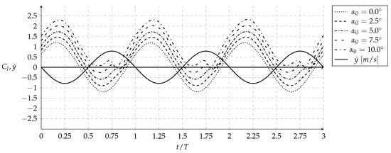 Therefore, in Figure 16, the lift coefficient is shown as a function of , with and . The airfoil’s instantaneous velocity is also presented, kept constant while varying the mean angle of attack.