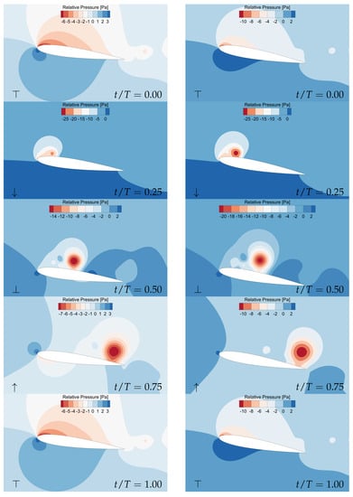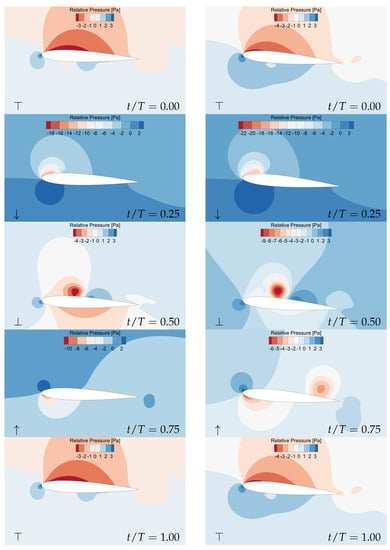 This slight decrease of the lift coefficient is due to the fact that a low-pressure zone created during descent that greatly enhances lift, is convected on the upper side of the airfoil, and then leaves at the trailing edge, moment when lift is reduced. This phenomenon, clearly visible for , is represented in Figure 17 and Figure 18 where the pressure distribution (relative to the free-stream pressure) is shown.