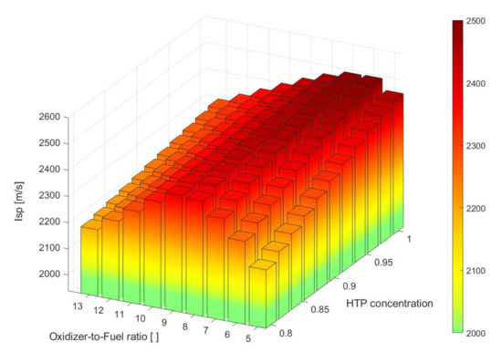 Theoretical performance calculations of HTP hybrid rocket motors using PE as fuel can be seen in Figure 1. Computations were done using NASA CEA [88] with Matlab in-house code utilized for results visualization, while the MatlabCEA tool [89] was used to connect Matlab with NASA CEA. A motor chamber pressure of 20 bar and a 20:1 nozzle expansion ratio were set assuming flow frozen at chamber. Data for various HTP concentrations are presented. The 98% HTP grade allows for reaching a 4.5% higher specific impulse than in the case of the 87.5% grade, which is popular in Europe. Additional system-level gain is available due to the increased density of 98% HTP (1431.0 kg/m3 vs. 1373.3 kg/m3 at 25 °C). Higher HTP concentrations have lower optimal oxidizer-to-fuel ratios but lead to an increase in volumetric performance. Use of 98% HTP provides a 3.5% increase in specific impulse in comparison to motors using N2O as oxidizer and the gain in terms of density-specific impulse is 70% [2]. Moreover, the high oxidizer-to-fuel ratio of HTP hybrids allows for efficient vehicle sizing and launch mass minimization. While work with hybrid rocket motors using 98% HTP has not been described in the literature until the 21st century, tests of 98% HTP within catalyst beds were mentioned in the literature in the early 1960s [90].