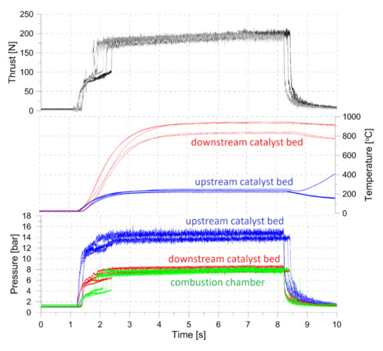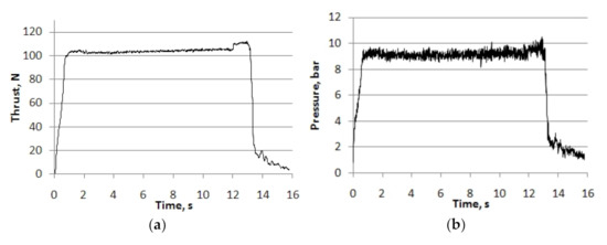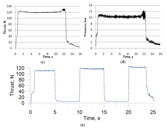 The first lab-scale, 100 N class, hybrid rocket motor was successfully fired in 2012. All hardware, including the feed system and the motor, were assembled at the Institute of Aviation. The decomposition catalyst was based on stainless steel–alumina wire mesh-supported platinum, packed in a 200 mm pile. The catalyst bed applied for further experiments was modified by means of length reduction and replacement of the catalyst with alumina-supported manganese oxides. The results of the first tests, performed with in-house made catalysts, are presented in Figure 2, and further data are available in [87]. These tests utilized a single circular port grain. Single firings (see Figure 2a–d) [87] were performed using a catalyst bed of 50 mm in length with different HTP feeding pressures (12 bar and 14 bar, respectively). Pulse-mode operation (see Figure 2e) was also successfully demonstrated. Catalyst preheating allowed for minimization of the time needed for reaching the nominal thrust level, and the monopropellant phase was eliminated (below 0.1 s was needed to obtain maximum thrust).