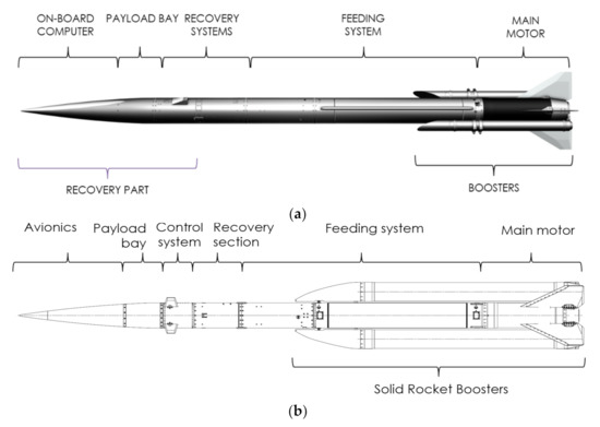 Small-scale testing led to validation of hybrid motor performance modeling. Experience was also gained with handling high concentrations of hydrogen peroxide, also due to the finalization of the first international projects connected to using hydrogen peroxide in various chemical propulsion systems. The demonstrated reliability of hybrid rocket motor ignition, firing stability and the Institute’s increased focus on space technology led to further development plans [100]. The decision to develop a small suborbital rocket was made. Experience from internal R&D actions and projects conducted within the programs of the European Space Agency and European Commission was to be used. Moreover, team expansion was planned, based mainly on the swift transition of technical university graduates to young professionals—this included using the outcome of the educational Polish Small Sounding Rocket Program run at Warsaw University of Technology [101,102]. The new rocket was to be fully developed at the Institute of Aviation and had the goal of demonstrating capabilities in the field of space transportation and advanced chemical rocket propulsion. As discussed in [103], the propulsion system trade-off led to the selection of hybrid rocket technology based on 98% hydrogen peroxide. The alternative was a green bipropellant system due to this technology being developed in parallel projects at the Institute of Aviation [104,105,106]. The vehicle was sized in order to allow the launch of small suborbital payloads to the Von Karman Line. Efforts dedicated to defining the configuration of the new hybrid rocket vehicle took place in late 2014, and in 2015, hardware developments were initiated. It was decided to use two solid rocket motor boosters along the main hybrid stage, which allowed vehicle mass minimization and overall mission thrust-curve optimization [2]. The rocket was named ILR-33 AMBER and was to present the world’s first in-flight use of 98% hydrogen peroxide.