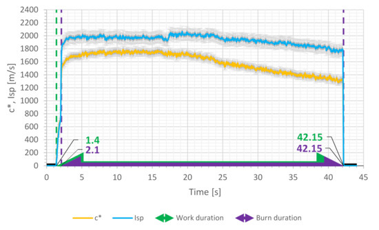 Results of test-bench hot-firing of the Mk2019+ hybrid rocket motor: the characteristic velocity and specific impulse obtained are shown, including their determination uncertainties.