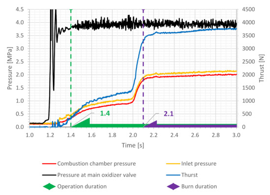 Full-scale hybrid rocket motor tests were conducted on several development models. Figure 7 presents one of the firings, where the Mk2018 motor was used. Since 2017, several advances have been made both in terms of modeling as well as regarding motor design features. The Mk2020 motor is the most advanced version, using a minimum erosion nozzle insert, thus maximizing the delivered performance. Its predecessor, the Mk2019+, is a lower-performance motor due to the use of a graphite throat insert, which shows erosion. Results of Mk2019+ firings are shown in Figure 8. Data presented include characteristic velocity and specific impulse values during a full burn duration firing. Their uncertainty is marked in Figure 8. Thrust, chamber pressure and oxidizer mass flow uncertainties were taken from manuals of the measurement instruments used. A 2% uncertainty of determination of the nozzle throat area was assumed a priori, while its linear erosion rate is considered to be constant in time and was calculated using the initial and post-firing nozzle diameters. Figure 9 shows the start-up phase of the Mk2019+ motor. The transition from monopropellant to hybrid mode is visible.