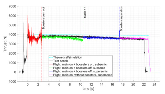 A comparison of the flight performance of the Mk2017 hybrid rocket motor with its initial performance simulation and data from its first ground firing was done. A different burn duration was used during flight via different oxidizer mass loading. Apart from this, the in-flight performance was close to that measured on the ground—while the first post-flight estimations can be seen in Figure 10 (when simplifications regarding base drag estimation were used), further analyses of data showed that in-flight performance was 1% above test-bench data in terms of thrust (recalculated to sea-level performance, but omitting the 2.6 s duration of booster stage burn, when less precise data are present due to high vibrations of the whole vehicle and higher acceleration measurement dispersions). Some difference in thrust can be seen around 10.5 s—it is, however, due to some inaccuracy regarding determination of the aerodynamic coefficients at Mach 1, which were used for recalculating the thrust curve from flight. This shall be discussed further in a dedicated paper. It can be seen that during the maiden flight of the ILR-33 AMBER rocket, booster separation occurred approximately 15 s after the end of burn. This was due to non-nominal performance—aerodynamic loads were used to ensure immediate separation of the booster stage at their burnout, as discussed in [103,113]. Further flights included booster separation systems using pyrotechnical devices apart from aerodynamic loads, which was found to be successful.