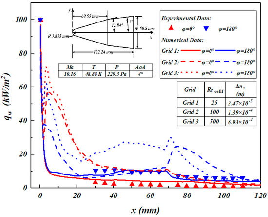 This paper uses the typical blunt-headed double cone in the NASA-2334 Report [26] as the verification model, and the shape parameters are shown in Figure 2. The incoming flow conditions of the verification example are shown in Figure 2. The pressure is 229.3 Pa, the temperature is 48.88 K, the speed is 1429 m/s, the Mach number is 10.16, the aircraft wall temperature is 300 K, and the angle of attack is 4°. The heat flux distribution along the flow direction at the central axis of the windward surface (φ = 180°) and the leeward surface (φ = 0°) is obtained. The numerical data are compared with the experimental data in Ref. [26]. When the cell Reynolds number is smaller, that is, the first layer grid height of the near wall in the normal direction is smaller, the numerical data are in good agreement with the experimental data (as shown in Figure 2).