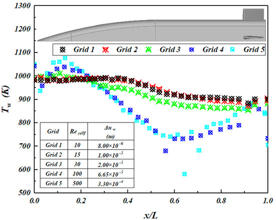 The aircraft and its flow field are taken as the computational domain, and the boundary conditions include pressure-far field, pressure-outlet, wall and symmetry. The computational domain is divided into unstructured grids by ICEM CFD 19.1. Numerical calculation of hypersonic aerodynamic heating requires a high quality of grid near the wall. The first layer grid height of the near wall in the normal direction (Δnw) is an important factor affecting the numerical calculation of hypersonic aerodynamics. In this study, the wall cell Reynolds number method based on the free flow conditions is used to calculate the Δnw [23,24]. In addition, the growth rate of the boundary layer grid near the wall is controlled to be 1.05 to 1.1, which makes the boundary layer grid grow evenly to meet the calculation requirements of turbulence model for near-wall grid.