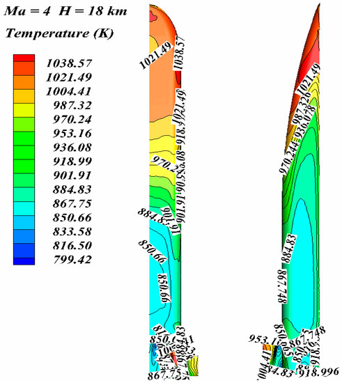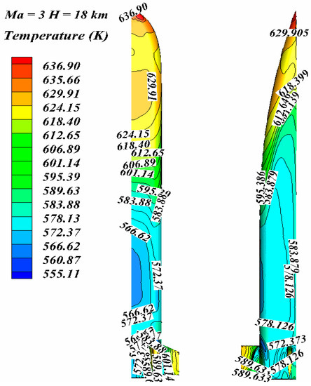 Figure 4, Figure 5 and Figure 6, respectively, show the isotherm distribution on the leeward side of aircraft at Mach 3–5. The aircraft is a wedge-shaped structure, and a shock wave is formed at the nose cone. The head of the aircraft is heated most seriously by aerodynamic heating, and its temperature is the highest temperature of the whole aircraft, while the fuselage temperature is decreasing along the air flow direction.