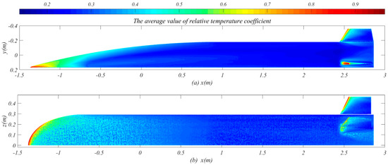 The distribution of relative temperature coefficient is obtained by post-processing wall temperature, and the average value of relative temperature coefficient under different flight conditions is calculated. The visualization results are shown in Figure 8. In the nose cone region, where x is less than −1 m, the rt is greater than 0.6. The rt on the leading edge of nose cone and windward side of tail is close to 1, which is closest to the highest wall temperature. In Figure 8a, the rt of the leeward side where x is located from 1 m to 2.5 m is less than 0.3, which is the region closest to the lowest temperature. In Figure 8b, the distribution of rt on the leeward side is uneven, but the maximum value does not exceed 0.35, which is close to the region with the lowest wall temperature. The area near the lowest wall temperature in the leeward side is very considerable.