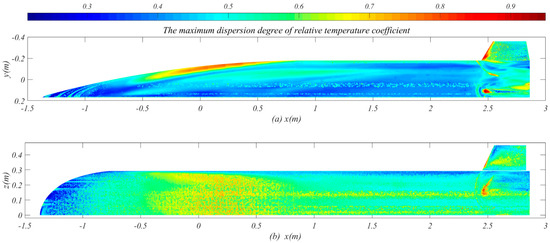 The maximum dispersion degree of relative temperature coefficient on leeward side considering all flight conditions: (a) the side view of aircraft; (b) the top view of aircraft.