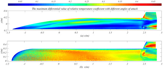 The maximum differential value of relative temperature coefficient with different angles of attack: (a) the side view of aircraft; (b) the top view of aircraft.