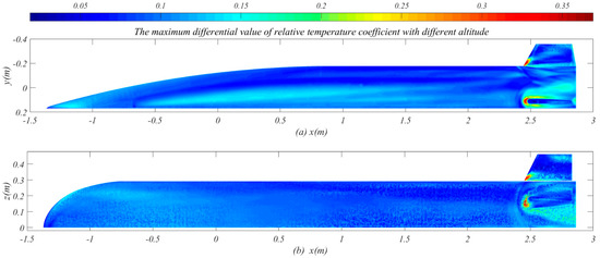 The maximum differential value of relative temperature coefficient with different altitude: (a) the side view of aircraft; (b) the top view of aircraft.