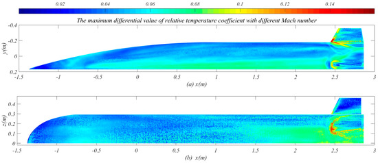 The maximum differential value of relative temperature coefficient with different Mach number: (a) the side view of aircraft; (b) the top view of aircraft.