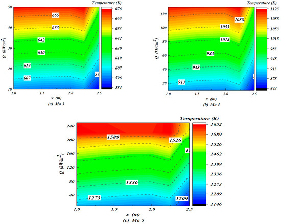 Figure 13 show that the thermal equilibrium temperature changes with the heat dissipation capacity Q along x direction at the low-temperature region under Mach 3–5. In Figure 13, the heat dissipation capacity (Q) at each position (x/L) corresponds to a thermal equilibrium temperature. Taking stagnation temperature as the highest equilibrium temperature, the maximum heat dissipation capacity can be determined according to the above formula, as shown in Table 2. The maximum capacity is 30 kW/m2 at Ma 3, 90 kW/m2 at Ma 4 and 200 kW/m2 at Ma 5. The low-temperature region has a strong heat dissipation capacity, which gradually increases along the x direction and the increasing Mach number.