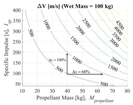 where g is gravitational acceleration (≈9.8 m/s2), Mwet is wet mass in kg, and Mpropellant is propellant mass in kg. Based on the definition for post-boost stages and kick motors in Section 1.2, the Mwet is a constraint of the launch vehicle, and thus Equation (1) can be considered predominately a function of Isp and Mpropellant, as shown by the contours in Figure 2. For the purposes of demonstrating the sensitivities of ΔV to Isp and Mpropellant, Mwet has been defined for convenience to be 100 kg. Thus, the values of Mpropellant shown as the abscissa in kg, can also be interpreted as percentages of Mwet—i.e., propellant mass fractions. The two key takeaways from Figure 2 are that: (1) both increasing the Isp and Mpropellant of the propulsion system greatly improves ΔV; and (2) that increasing the propellant mass has an even greater impact on ΔV than increasing the Isp. The latter point will be the explanation for some of the surprising, or counterintuitive results of this paper. Note that this takeaway is obvious from Equation (1), since ΔV is linearly proportional to Isp, while Mpropellant is in the denominator of the logarithm term. However, the non-linearity of the sensitivity to Mpropellant is difficult to intuit, and combined with lack of a standardized mass formulation makes quantitative comparisons of propulsion systems regarding Mpropellant challenging. Lastly, Isp is changing in time in most hybrid rockets, due to a mixture ratio shift, typically referred to as “O/F shift.” Accordingly, the analysis in this paper will consider the effect of both terms when evaluating performance (potential).