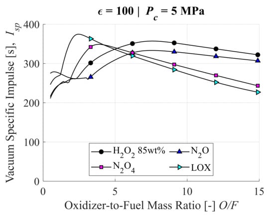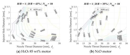 Due to the increased number of possible outcomes and avenues of investigation available, as well as the increased computational cost of calculating ΔV, the decision was made to focus this part of the research on the two most promising candidates from the previous section: H2O2 85 wt% for maximizing ΔV; and N2O for maximizing . Moreover, the empirical formulations for the H2O2 85 wt% are not available in the literature, and so the empirical coefficients for the LOX case in Table 4 were implemented instead. Since the mass fraction of hydrogen content in H2O2 85 wt% is roughly 7%, meaning that the remaining 93% is oxygen, this approximation seems appropriate enough for the purposes of the investigation at hand.