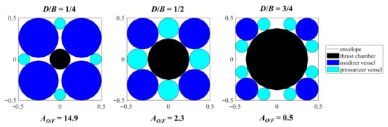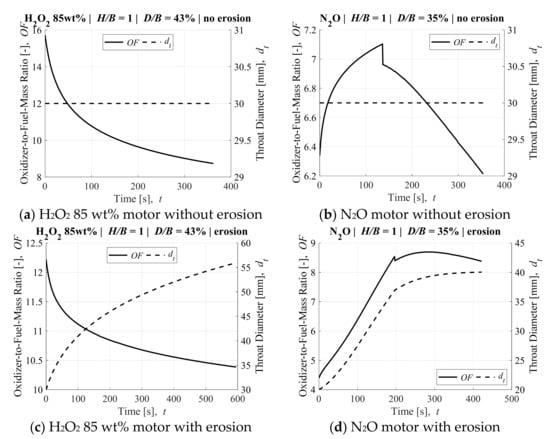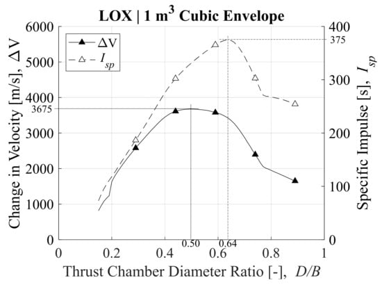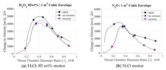 The results are presented in two parts. The first part compares the ΔV of the post-boost stage/kick motors using the four oxidizers—i.e., H2O2 85 wt%, N2O, N2O4, and LOX—under the assumption that O/F and At are constant during combustion. This means that the algorithm in Section 2.5 is unnecessary, and ΔV can be determined according to Equation (1) alone. The second part focuses on the two highest performing cases to investigate to what degree O/F shift and nozzle throat erosion are likely to degrade ΔV. In both parts, the independent variable is the ratio of thrust chamber diameter to envelope base, D/B, which also determines the space available within the envelope for the oxidizer vessels, and in turn the pressurizer vessels for the gas-fed motors. Moreover, ΔV is calculated based only on the masses of the thrust chamber, oxidizer supply system, and structure as outlined in Section 2.4. For this reason, the results of ΔV are larger than should be expected in practice, which would include the additional non-propellant masses of the payload, bus etc.