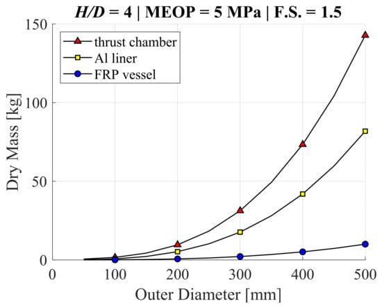 The benefit of standardizing the thrust chamber in this way is evident in the plots in Figure 7, which show the dry masses, i.e., the mass without fuel or oxidizer, as functions of outer diameter—where height-to-diameter ratio H/D = 4, MEOP = 5 MPa, and F.S. = 1.5. The main takeaway is that the dry mass is much larger for the thrust chamber than the pressure vessels. This means that hybrid rocket motors which require relatively large thrust chambers, such as the LOX motor, will have a lower propellant mass fraction than motors which can suffice with smaller thrust chambers. Note that the plot of the “Al liner” in Figure 7 has been added to clarify the reason for this mass disparity, and its theoretical limitations. The Al liner is a vessel with the same shape as the FRP vessel (see right-hand side of Figure 6), but with the density and strength of the thrust chamber case. Thus, even if the thrust chamber insulation, liners, mixing spacers, and nozzle skirt were abandoned, it would never approach the light weight of the pressure vessels, at least not unless a similar FRP construction was used for the thrust chamber as well. Stated another way, to make LOX motors competitive in terms of propellant mass fraction, it is necessary for the thrust chamber to be constructed with FRP, whereas this may not be necessary for the N2O and H2O2 motors which have smaller thrust chambers.