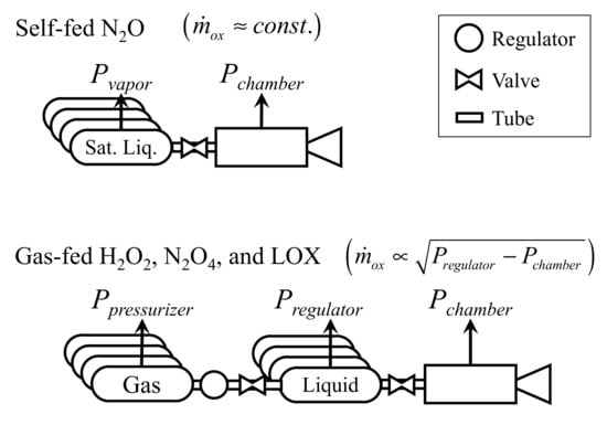 Simplified schematic of self-fed N2O supply, and gas-fed oxidizer supply systems.
