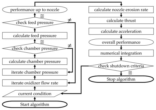 Computational flow chart of the hybrid rockets internal ballistics simulation algorithm.