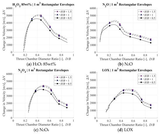 The results of the calculations for ΔV for each of the four oxidizers: H2O2 85 wt%, N2O, N2O4, and LOX, are shown in the plots in Figure 10 for each of the three envelopes: H/B = 1/2, H/B = 1, H/B = 3/2.