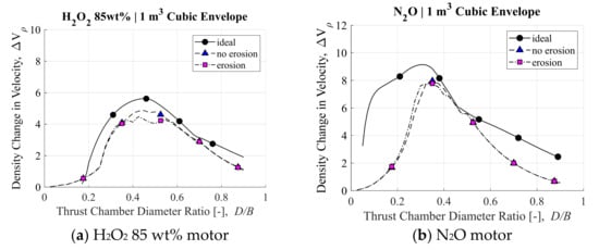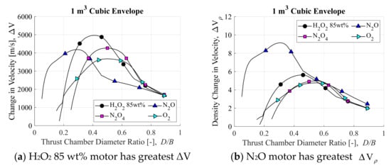 In this research which controlled for the envelope volume as Venvelope = 1, dividing by Mwet alone would result in the same values for . However, if volume is not included in Equation (10), the would scale with mass for all other cases where the volume is not one. Thus, as a term which is applicable to extrapolation, the motor density must be used. In this sense, the density change in velocity contains all the information important to the end user, who understands both the envelope volume and mass limitations of the launch vehicle. For an end user with little space yet ample mass budget, the H2O2 motor is the best option. For an end user with ample space yet a strict mass budget, the N2O motor is best option. Answering the question of where exactly the line is drawn in selecting between these two types of systems is outside the scope of this paper.