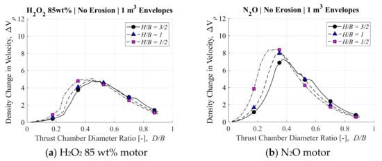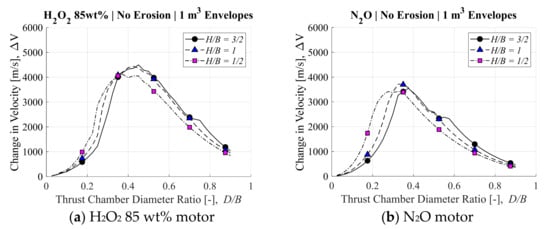 One benefit of using a brute force grid search type for the maximum ΔV is that the contour maps of the solution space can be checked at will. The contour maps of the highest performing motors are shown in Figure 13. The solution space of the N2O motor in Figure 13b, although not easy to replicate with simple algebra, is much more straight forward than the solution space of the H2O2 85 wt% motor in Figure 13a. In a positive way, there is not such a narrow range of injector hole diameters—roughly 1.5 to 3 mm—that result in ΔV > 3500 m/s when the throat diameter is 30 mm. Furthermore, there is an even larger range, two separate ranges in fact, of such values for the H2O2 85 wt% motor where ΔV > 4000 m/s. However, of some concern for applying these motors in practice is that in both cases these regions reside next to cliffs of meaningless solutions (ΔV < 500 m/s). Further investigations regarding this landscape require an analysis outside of the purview and objectives of this research. The results of ΔV for each type of motor without nozzle erosion for each envelope are plotted in Figure 14, and the corresponding results of are plotted in Figure 15. One takeaway from Figure 14 and Figure 15 is that the thrust chamber diameter ratio that corresponds to the maximum ΔV of the H2O2 85 wt% motor is only slightly affected by the envelope shape, and more so for the H2O2 85 wt% motor than the N2O motor when internal ballistics simulations are used to estimate ΔV. This is because there is simply much more oxidizer mass than the nitrous oxide motor due to the higher density. Recall from Figure 4 that the optimum O/F are close in value for both oxidizers, yet since the density of H2O2 85 wt% is more than twice that of N2O, a larger thrust chamber containing twice as much fuel is necessary to achieve this optimum O/F. Meanwhile, the fuel length is fixed, so variation in burning surface area during firing is exacerbated and leads to more sporadic results. Another takeaway is that plots of both motors skew to the left—i.e., lower D/B—for lower values of H/B. Once again, this trend reflects the dependence of fuel and oxidizer mass on thrust chamber diameter when the height is fixed. Since the skew is to the left, it means that the shorter the H/B, the smaller the motor diameter which is needed to maximize performance, regardless of the oxidizer used. Lastly, the magnitude of the skew is greatest for the plots in Figure 15b, which show that the most mass efficient motor of this study is the short and flat—i.e., H/B = ½—N2O motor, with > 8 m4/kg-s.