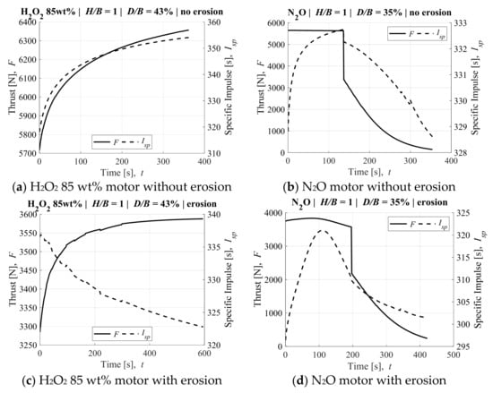 In this second part of the research, more realistic estimates of ΔV will be calculated to understand how well hybrid rockets align with their theoretical ideal performance. This time, the ΔV are calculated according to the internal ballistics simulation algorithm in Section 2.5. These calculations are carried out in two sets. In the first set of calculations, nozzle throat erosion is neglected, and in the second it is calculated by assuming that the nozzle throat wall temperature Tw is always 80% of the combustion gas temperature at the throat, which is the upper end of the values that the authors have experienced in practice.